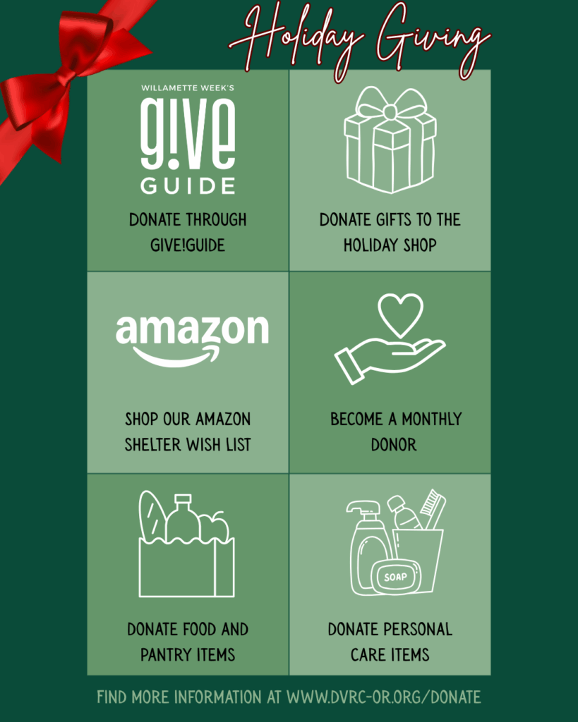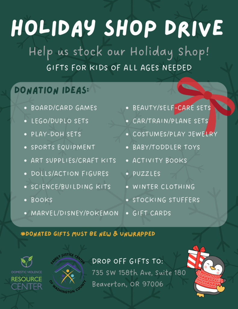 2. Donate gifts to the Holiday Shop! The Holiday Shop opens each December and gives survivors in need the ability to pick up free holiday gifts for their kids. The Holiday Shop is a collaboration between DVRC and the Family Justice Center of Washington County and supported nearly 300 survivors and their children with gifts last year. Donated gifts must be new and unwrapped. Find more information about our needs below.